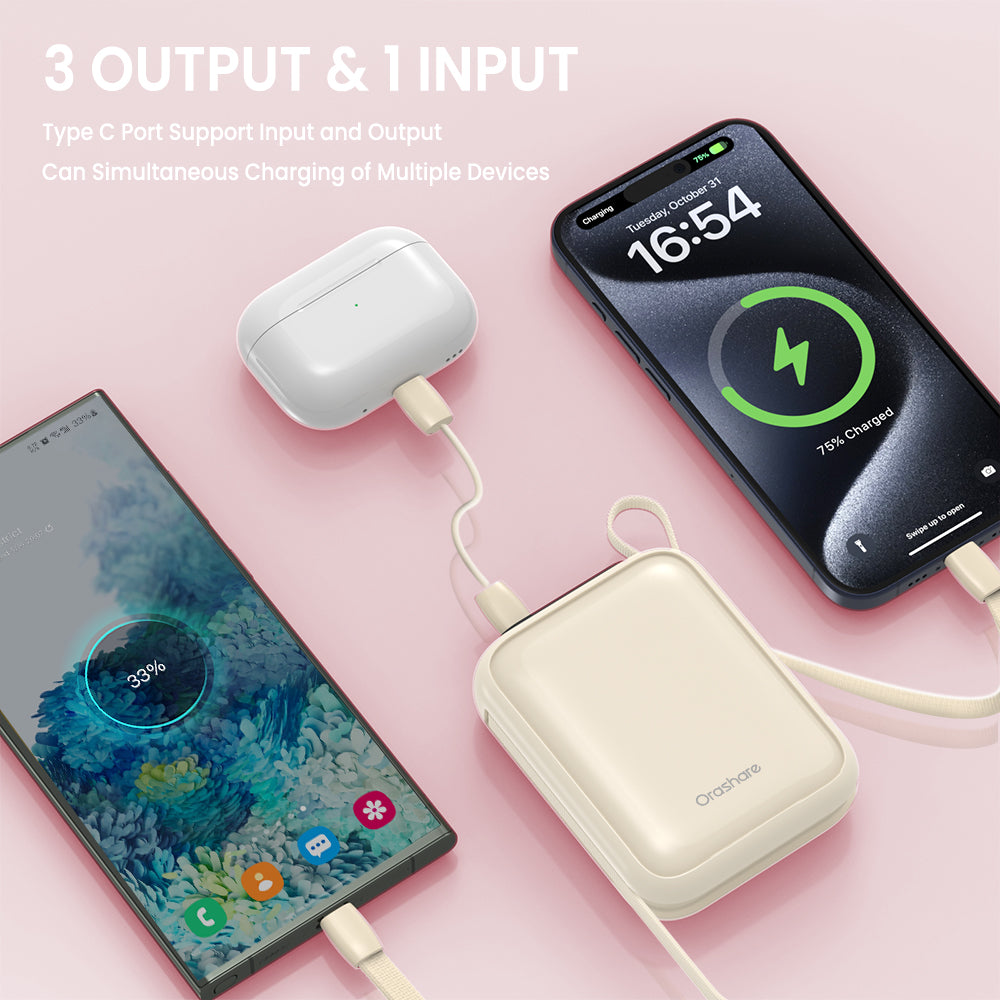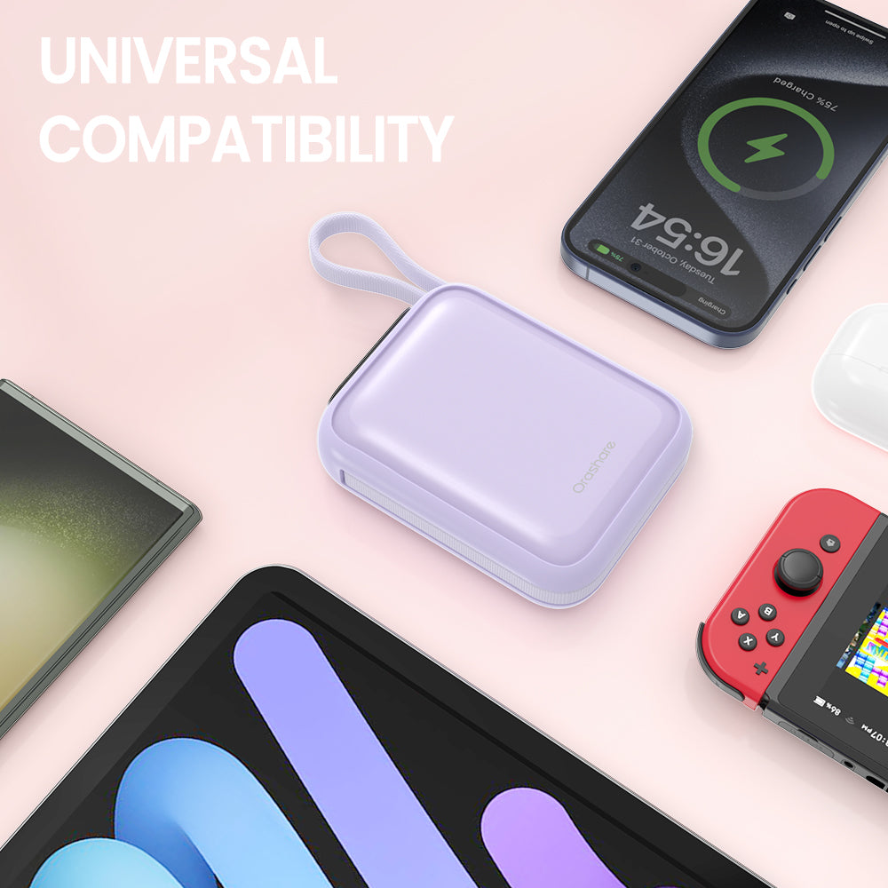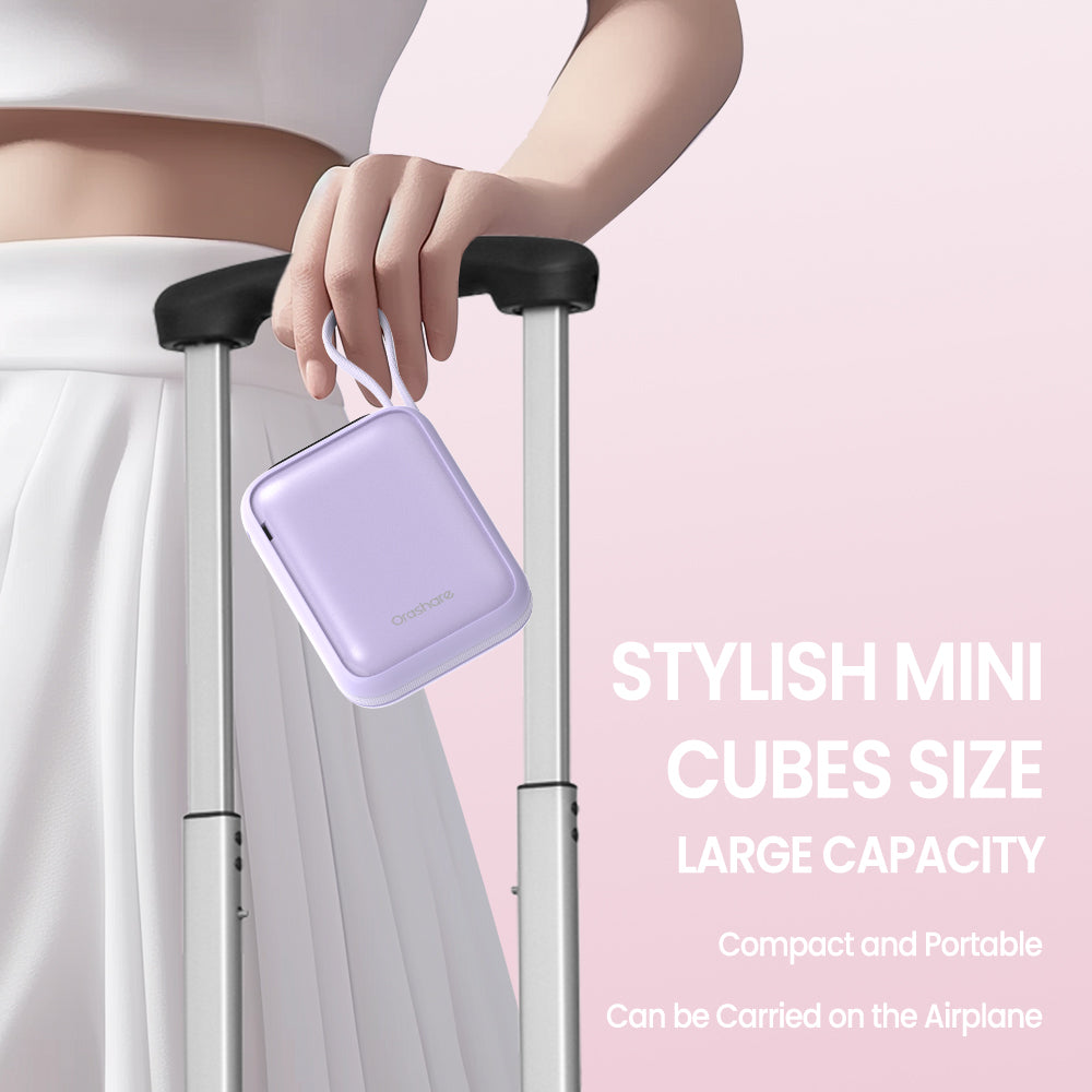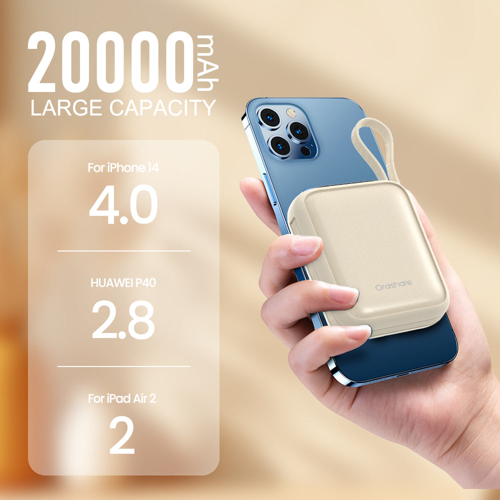 The Orashare PCM20 is a compact and portable 20000mAh mini power bank with 22.5W super fast charging, featuring built-in Type-C and Lightning cables. Ideal for travel, it allows simultaneous charging of multiple devices and is approved for airplane use.