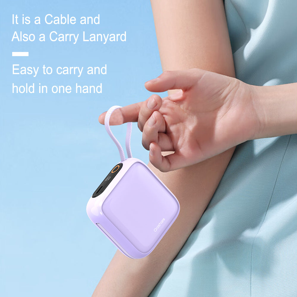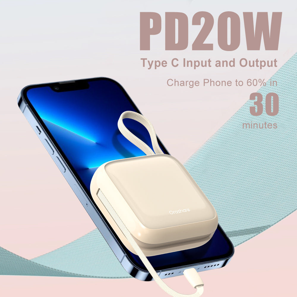 The Orashare PCM10 is a super mini and ultra-compact 10000mAh power bank with built-in Type-C and Lightning cables, supporting PD 20W and SCP 22.5W fast charging. With its stylish cube design, it’s easy to carry and perfect for charging up to three devices at once, making it an ideal travel companion.