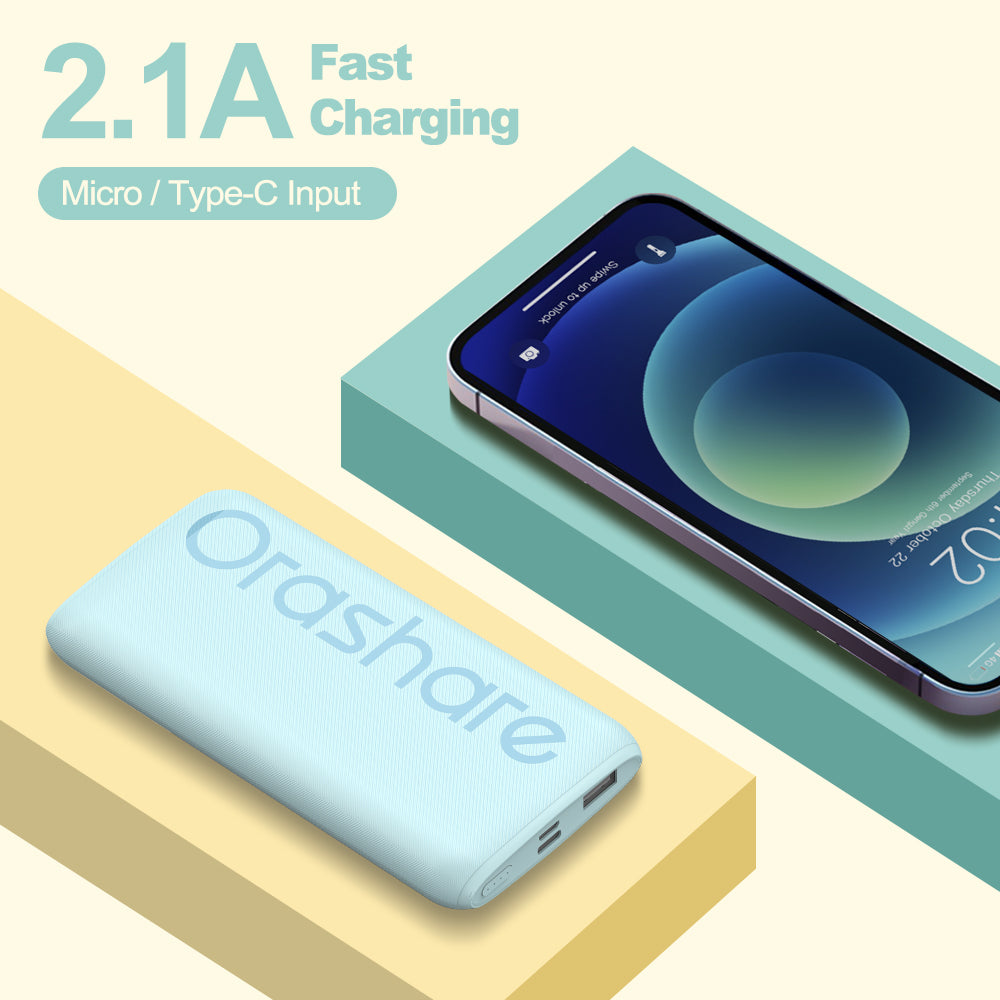 The Orashare O10 10000mAh Power Bank is a slim, stylish, and portable power solution that’s perfect for on-the-go charging. It provides fast 2.1A output and can charge an iPhone X up to 2.5 times, making it ideal for daily use.